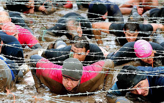 硬漢大賽:一年一度的英國(guó)硬漢挑戰(zhàn)大賽在英格蘭中部的伍爾弗漢普頓市舉行,共有接近3000名選手參加這項(xiàng)被譽(yù)為叢林戰(zhàn)士的賽事。參賽者需要在火焰中奔跑,穿越齊腰深的沼澤地,在帶刀片的鐵絲網(wǎng)下爬行,躍入冰冷的湖中……