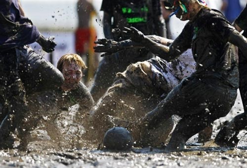 泥地足球:德國(guó)北部海邊小鎮(zhèn)Brunsbuettel的泥灘上進(jìn)行的泥地足球賽。男女“球員”混合在一起,泥地中盡情撒野。