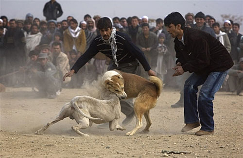 斗狗大賽:阿富汗舉行的斗狗大賽,數(shù)千名當?shù)厝司奂诳Σ紶柦纪庥^看該項比賽。