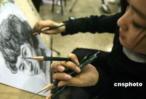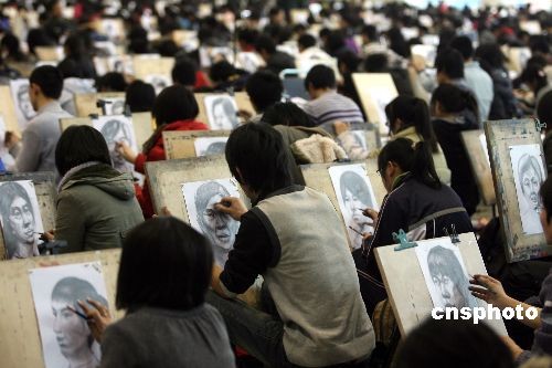 2月5日上午8點整,山東省2009年藝術類考生藝術專業(yè)考試正式拉開帷幕。山東工藝美術學院由于考生人數(shù)眾多,將考場搬進了20000余平方米的濟南市舜耕會展中心,讓近7000多名美術類專業(yè)考生在展廳內(nèi)同時參加考試,一展身手。