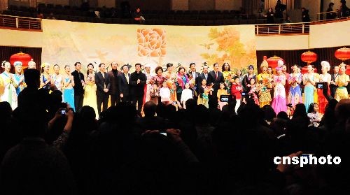 由國(guó)務(wù)院僑辦主任李海峰率領(lǐng)的“文化中國(guó)·四海同春”藝術(shù)團(tuán),當(dāng)?shù)貢r(shí)間2月4日晚在華盛頓成功演出,當(dāng)?shù)厝A僑華人千余名觀眾演出結(jié)束后簇?fù)砦枧_(tái)久久不肯散去。國(guó)僑辦主任李海峰、中國(guó)駐美大使周文重夫婦走上舞臺(tái)和演員們合影。