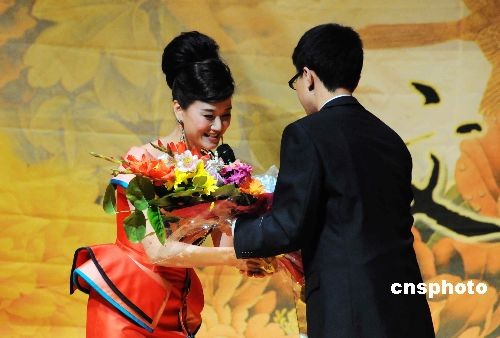 圖為熱情的華盛頓“英迷”走上舞臺(tái)向宋祖英獻(xiàn)花。中新社發(fā) 邱江波 攝
