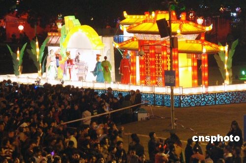二月五日晚,福州元宵燈會(huì)在市區(qū)五一廣場(chǎng)、南后街同時(shí)正式亮燈,數(shù)百盞花燈呈現(xiàn)出濃濃的節(jié)日氣氛。福州五一廣場(chǎng)展出的一系列反映“老福州”傳統(tǒng)民俗文化內(nèi)容的燈組,吸引絡(luò)繹不絕的福州市民前來賞花燈。中新社發(fā) 劉可耕 攝