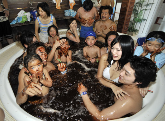 2月8日,游客們?cè)谌毡旧衲未ǹh享受奇特的“巧克力浴”。