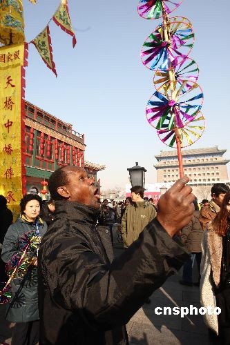 元宵節(jié)來(lái)臨,北京前門(mén)大街舉行民間花會(huì)踩街活動(dòng),一名外國(guó)觀(guān)眾手舉風(fēng)車(chē)玩得很過(guò)癮。踩街是一種中國(guó)傳統(tǒng)民間民俗藝術(shù)表演形式,類(lèi)似國(guó)外的花車(chē)游行,表演隊(duì)伍邊行進(jìn)邊表演,百姓沿途觀(guān)看。中新社發(fā) 杜洋 攝