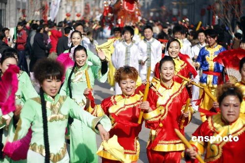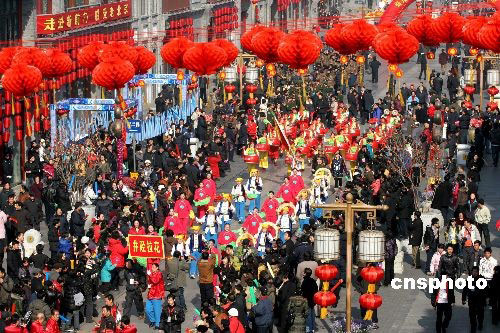 2月9日上午,來自北京、河北、山東等3個(gè)省市的12支花會(huì)隊(duì),在前門大街舉行“傳統(tǒng)民間花會(huì)踩街”活動(dòng),喜迎正月十五元宵節(jié)的到來。踩街是一種中國(guó)傳統(tǒng)民間民俗藝術(shù)表演形式,類似國(guó)外的花車游行,表演隊(duì)伍邊行進(jìn)邊表演,游客沿途觀看;〞(huì)隊(duì)從正陽(yáng)門箭樓南側(cè)和前門五牌樓出發(fā),16只南獅和北獅為大隊(duì)人馬開道,隨后中幡、旱船、二魁摔跤、地秧歌、鼓子秧歌等將依次向珠市口行進(jìn)。