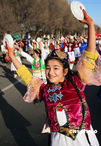 2月9日上午,新疆伊寧市舉行“鬧元宵”社火展演,來(lái)自全市20個(gè)鄉(xiāng)鎮(zhèn)、街道的1300余名農(nóng)牧民及社區(qū)工作人員走上街頭,舞龍獅、敲腰鼓、跳民族歌舞,敲出元宵節(jié)的快樂(lè),舞出了邊疆各族兒女的豪邁激情。中新社發(fā) 留光駐影 攝