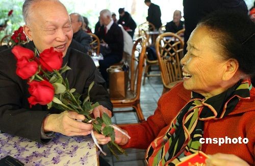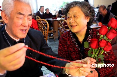 2月9日,中國傳統(tǒng)元宵佳節(jié)到來之際,北京植物園上演的“浪漫玫瑰文化周”吸引99對(duì)金婚夫婦共度元宵佳節(jié),特邀而來的金婚夫婦(結(jié)婚滿50年)手捧著政府當(dāng)年頒發(fā)的不同版本的結(jié)婚證,相互獻(xiàn)上象征愛情的紅玫瑰、相思紅豆,交換金婚禮物,重溫愛的誓言,在鮮花前回憶浪漫的美好時(shí)光,許多長(zhǎng)者回憶起風(fēng)風(fēng)雨雨幾十年的時(shí)光,激動(dòng)得熱淚盈眶。中新社發(fā) 錢興強(qiáng) 攝