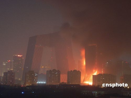 2009年2月9日晚,北京市京廣橋附近的央視新大樓北配樓發(fā)生火災(zāi)。 中新社發(fā) 馬毅行 攝