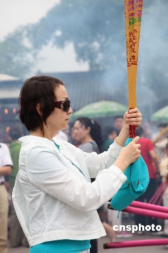 圖為宋丹丹三亞南山燒香祈福。