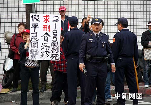 圖:民眾在臺(tái)北地院門口舉標(biāo)語(yǔ)牌抗議吳淑珍