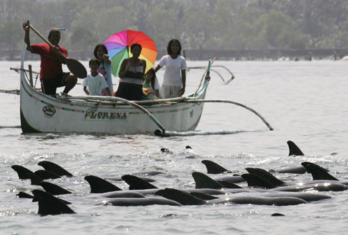 2月10日,約300只海豚被困在菲律賓巴丹省馬尼拉灣離岸不足1000米的近海水域,當(dāng)?shù)鼐用、菲律賓海岸警衛(wèi)和環(huán)保團(tuán)體人士幫助它們安全返回大海。