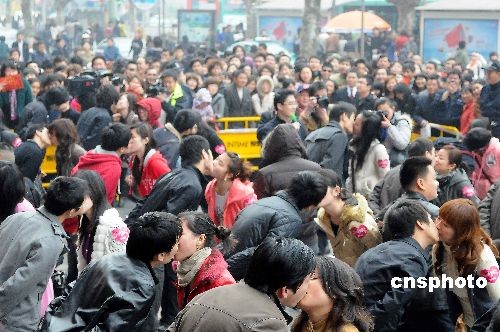 2月14日,杭州市首屆情人節(jié)“牛吻”大賽在武林銀泰、西湖銀泰、杭州百貨大樓三地同時(shí)舉行,活動(dòng)吸引了80對(duì)情侶前來參加。中新社發(fā) 引煒 攝