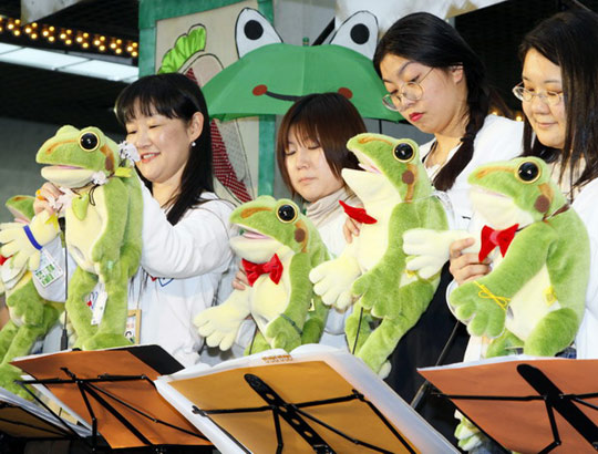 表演者在用青蛙玩偶演奏電子音樂(lè)。