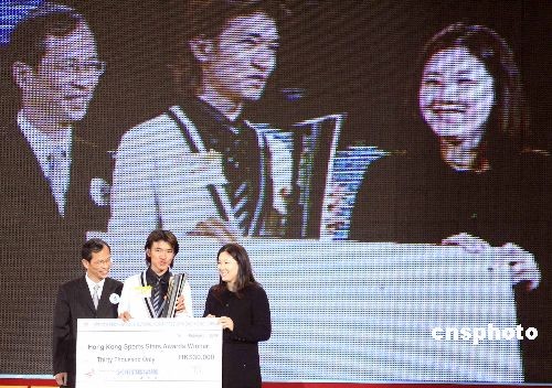 二月十六日,“2008中銀香港杰出運動員選舉”得獎結(jié)果在香港會展中心舉行的頒獎典禮上揭曉。圖為香港特區(qū)立法會主席曾鈺成與伏明霞為香港杰出運動員黃金寶頒獎。中新社發(fā) 張勤 攝