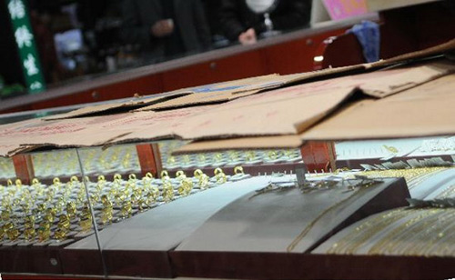當營業(yè)員招呼“顧客”時,四名嫌疑人瞅準時機,迅速地將柜臺上的玻璃掀起,伸手將柜臺里的黃金手鏈、項鏈拿出裝入隨身帶的白色包內。四人得手后迅速溜走。