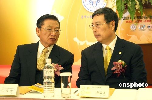 圖為臺(tái)灣;鶗(huì)董事長(zhǎng)江丙坤(左)與中華全國(guó)工商業(yè)聯(lián)合會(huì)主席黃孟復(fù)交談。中新社發(fā) 陳立宇 攝