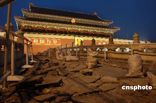 2月18日,為迎接新中國成立60周年,天安門管委會(huì)從當(dāng)日起對(duì)金水橋?qū)嵤┍Wo(hù)修繕。據(jù)悉,此次修繕工作將分階段進(jìn)行,由于施工圍擋防火板高度有限,因此金水橋和天安門城樓的整體景觀和游覽不會(huì)受到太大影響。工程擬于2009年5月1日前完工,并整體對(duì)外開放。中新社發(fā) 鄭雄增 攝