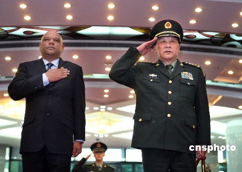 2月19日,國(guó)務(wù)委員兼國(guó)防部長(zhǎng)梁光烈上將在北京八一大樓會(huì)見(jiàn)來(lái)訪的馬爾代夫國(guó)防與國(guó)家安全部長(zhǎng)費(fèi)薩爾一行。中新社發(fā) 宋吉河 攝