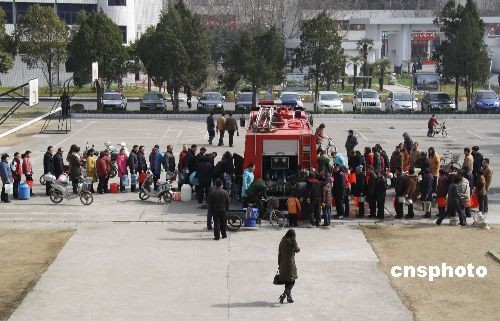 2月21日,江蘇省鹽城市各主干道上,消防車輛正為市民輸送安全用水,確保鹽城市民能夠安心喝上未被污染的自來水。由于水廠受酚類化合物污染,鹽城市區(qū)2月20日出現(xiàn)大面積停水,居民生活受到較大影響。造成本次停水的水源地污染原因已經(jīng)確認,偷排污水的鹽城標新化工有限公司被責令關閉,法人代表等相關責任人被采取強制措施。圖為鹽城市市委黨校內前來取水的市民排成了長龍。中新社發(fā) 童盛 攝