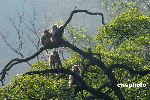 2009年2月21日,貴陽陽光明媚,黔靈公園里的猴子們吃飽喝足后,扒上高高大樹享受春光。中新社發(fā) 張?zhí)炝?攝