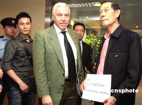 圖為香港海員工會(huì)主席郭錦華船長(zhǎng)(右一)向俄羅斯駐港領(lǐng)事館工作人員遞交抗議書(shū)。中新社發(fā) 張勤 攝