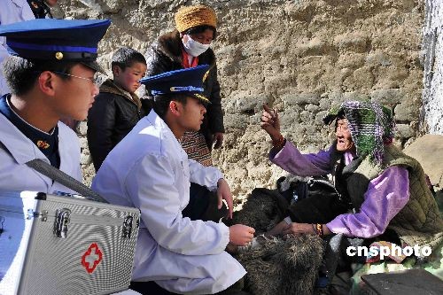 圖為醫(yī)療小分隊(duì)成員深入藏族同胞家中,為行動不便的病人診治。中新社發(fā) 郭超英 攝