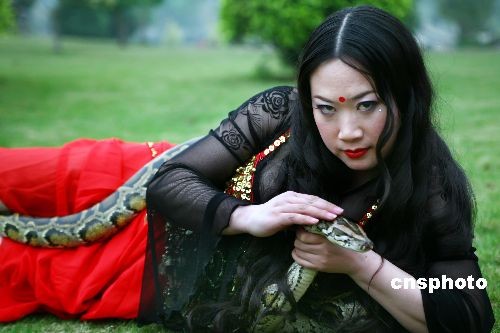 2009年2月21日,芙蓉姐姐應(yīng)邀參加南寧花花大世界首屆桃花節(jié)演出。演出結(jié)束后,到南寧動(dòng)物園與蟒蛇共舞,拍攝寫真。據(jù)悉,這條蟒蛇名叫“金剛蟒”,長(zhǎng)約3米,重15公斤。中新社發(fā) 駱文剛 攝