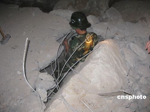 圖為都安縣消防官兵鉆入廢墟進(jìn)行搜救。中新社發(fā) 蘭寶喜 攝