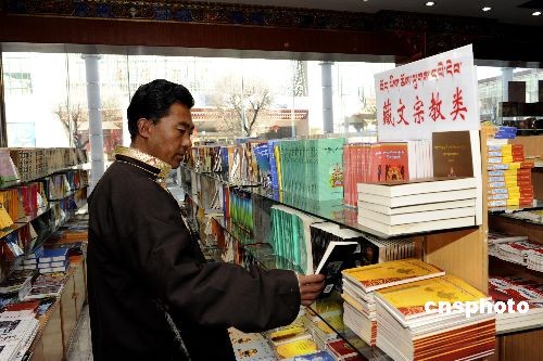 2009年初春,西藏拉薩一書店內(nèi),藏族民眾在選購藏文書籍。西藏自治區(qū)已經(jīng)累計(jì)出版各類藏漢文圖書11300種、1.5億多冊(cè)。中新社發(fā) 廖攀 攝