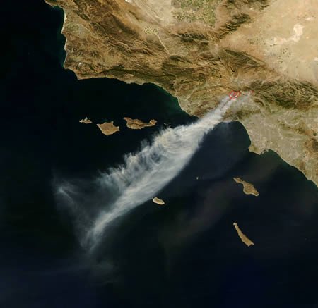 洛杉磯大火的煙霧:這張衛(wèi)星圖片上清晰可見,受強(qiáng)大的圣安娜颶風(fēng)影響,2008年10月中旬加州洛杉磯附近大火肆虐,風(fēng)助火勢,濃濃的煙霧甚至飄向很遠(yuǎn)的海面。
