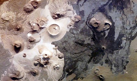 沙特阿拉伯的火山巖:卡伊巴爾有大片的火山巖壯觀地貌,本圖由國際太空站宇航員攝于2008年3月31日,所示的阿爾齊答山由不同年代的黑色玄武巖熔巖流形成,圖中淺色部分則是更黏性、富含硅石的火山巖,又稱流紋巖。