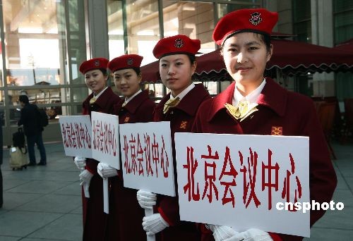全國(guó)“兩會(huì)”召開(kāi)在即,各賓館駐地的服務(wù)員3月1日在北京首都機(jī)場(chǎng)準(zhǔn)備迎接各地的代表、委員抵京。中新社發(fā) 杜洋 攝