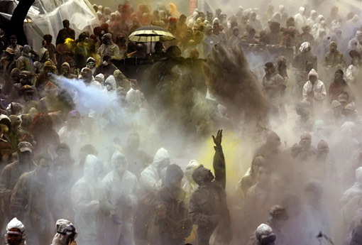 3月2日,人們?cè)谙ED雅典西北小城加拉希迪的街道上用加了各種天然顏料的面粉互相投撒,表達(dá)祝福。