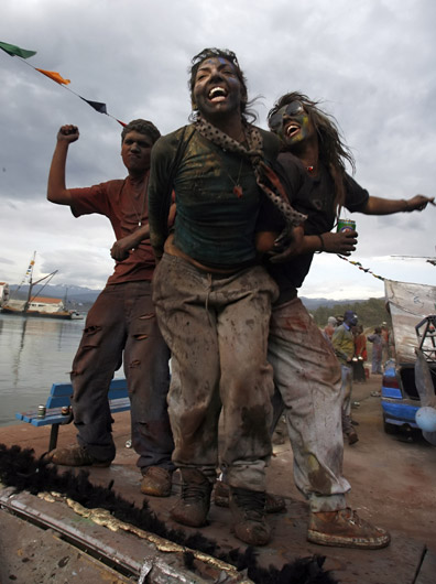 3月2日,人們在希臘雅典西北小城加拉希迪的街道上用加了各種天然顏料的面粉互相投撒,表達祝福。
