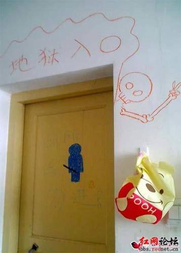 新婚快樂!天堂入口,地獄入口,照妖鏡……臨近寒假,某大學(xué)的一群女生集體在宿舍墻壁上涂鴉,創(chuàng)作了一批讓她們沾沾自喜的“杰作”。有好事者把“杰作”拍下來,發(fā)到紅網(wǎng)論壇,引來上萬網(wǎng)友回帖無數(shù)。