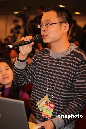 3月4日,在十一屆全國人大二次會議舉行的首場新聞發(fā)布會上,中新社記者孫宇挺就中法關(guān)系、圓明園獸首銅像被拍賣等問題向大會發(fā)言人李肇星提問。中新社發(fā) 張婭子 攝