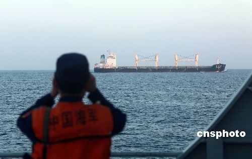 中國海軍護(hù)航編隊(duì)“海口”號(hào)導(dǎo)彈驅(qū)逐艦完成接護(hù)遭海盜襲擊商船“雁蕩!碧(hào)任務(wù)。圖為2月26日,接護(hù)途中護(hù)航官兵對(duì)商船進(jìn)行了望、警戒。2月25日,“雁蕩!碧(hào)由于供貨期限原因未能參加護(hù)航,在亞丁灣海域航行途中遭遇海盜襲擊。中新社發(fā) 孫自法 攝