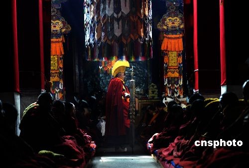 3月4日,中國(guó)藏歷新年正月初八,西藏拉薩哲蚌寺,“鐵棒喇嘛”在措欽大殿舉行的傳昭大法會(huì)上!拌F棒喇嘛”藏名:“格貴”,負(fù)責(zé)維持僧團(tuán)清規(guī)戒律的寺院執(zhí)事,歷史上藏傳佛教各大寺院的糾察僧官巡視僧紀(jì)時(shí),常隨身攜帶鐵杖,故有“鐵棒喇嘛”之俗稱。中新社發(fā) 廖攀 攝