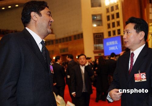 3月5日上午,十一屆全國(guó)人大二次會(huì)議在北京人民大會(huì)堂開(kāi)幕,全國(guó)人大代表、山西省副省長(zhǎng)李小鵬(右)會(huì)前與新疆維吾爾自治區(qū)主席努爾·白克力交談。中新社發(fā) 任晨鳴 攝