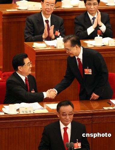 3月5日上午,十一屆全國人大二次會(huì)議在北京人民大會(huì)堂開幕,國務(wù)院總理溫家寶作《政府工作報(bào)告》后,與國家主席胡錦濤握手。中新社發(fā) 杜洋 攝