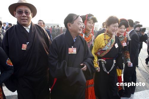 3月5日上午,十一屆全國人大二次會議在北京人民大會堂開幕。來自四川的全國人大代表甲登·洛絨向巴、李昌平等一同步入會場。中新社發(fā) 盛佳鵬 攝