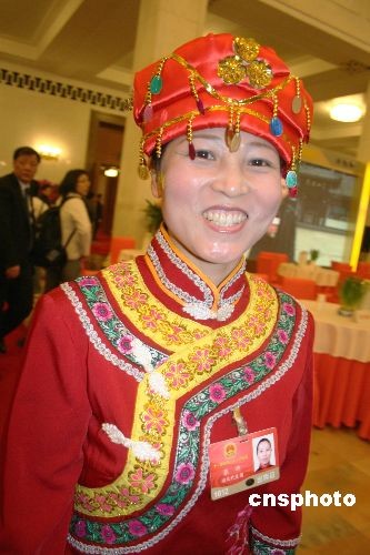 2009年3月5日,十一屆全國人大二次會議開幕。圖為來自湖北的土家族全國人大代表張瓊出席會議。中新社發(fā) 金立冬 攝