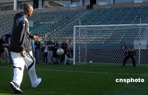 圖為這位籃球巨星射出一腳角度刁鉆的任意球,皮球擦著左門柱飛入網(wǎng)窩,世界足球小姐瑪塔只能望球興嘆。