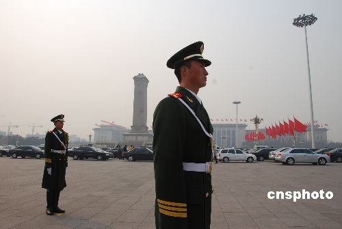 3月5日上午,全國(guó)人大十一屆二次會(huì)議在北京開(kāi)幕,國(guó)內(nèi)外3000記者云集京城,值勤武警在天安門(mén)廣場(chǎng)站崗值勤,吸引了眾多媒體的鏡頭。中新社發(fā) 韓海冰 攝