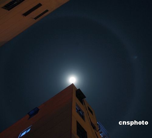 2009年3月6日21時(shí)起,山東棗莊天空出現(xiàn)罕見的月暈天象,甚為壯觀。據(jù)悉,月暈的形成是因?yàn)樘炜罩杏幸粚痈咴,月光透過云中的冰晶時(shí)發(fā)生折射和反射,在月亮周圍形成彩色光環(huán)。民間有“日暈三更雨,月暈午時(shí)風(fēng)”的說法。 中新社發(fā) 劉明祥 攝