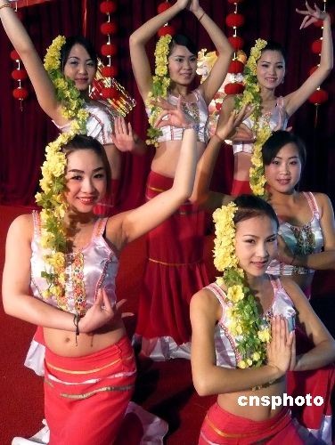 3月7日,為慶!叭.八”國(guó)際婦女節(jié)的到來(lái),北京植物園舉行賞花送花活動(dòng)。特設(shè)的“女人花”展區(qū)內(nèi)展示的花卉名稱(chēng)中均帶有“女”字:如“小葉女貞”、“舞女蘭”、“美女櫻”等。每位在熱帶展覽溫室參觀(guān)的女士,可以得到一束美麗的康乃馨。圖為云南傣族姑娘頭戴鮮花為參加活動(dòng)的游客表演舞蹈。中新社發(fā) 錢(qián)興強(qiáng) 攝