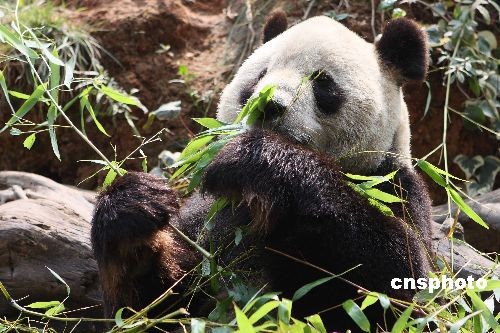 3月7日,一只大熊貓在云南野生動物園悠閑的享用美味竹葉。在“5·12汶川大地震”中,地處四川臥龍的中國保護大熊貓研究中心遭受重創(chuàng)。為了確保國寶大熊貓的安全,在地震發(fā)生之后,臥龍基地3只大熊貓被送到云南野生動物園暫養(yǎng)。日前,中國保護大熊貓研究中心專程來到昆明看望3只大熊貓。據(jù)悉,3只熊貓寶寶目前健康狀況十分良好。中新社發(fā) 保旭 攝