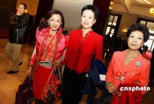 3月8日,全國(guó)政協(xié)十一屆二次會(huì)議舉行第三次全體會(huì)議。圖為李小琳(中)、鄭明明(左)等女委員著鮮艷服裝參加會(huì)議。中新社發(fā) 傅丹丹 攝
