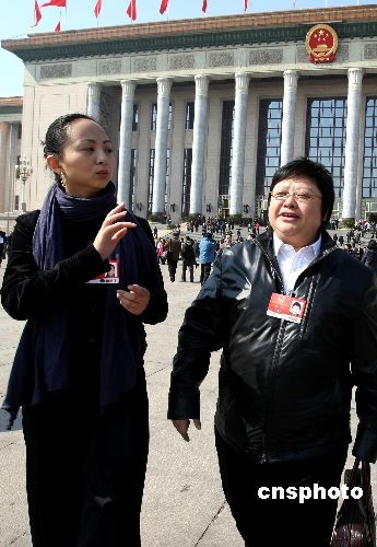 3月8日,全國(guó)政協(xié)十一屆二次會(huì)議舉行第三次全體會(huì)議。圖為“千手觀音”邰麗華與歌星韓紅在會(huì)議結(jié)束后一起步出大會(huì)堂。中新社發(fā) 傅丹丹 攝